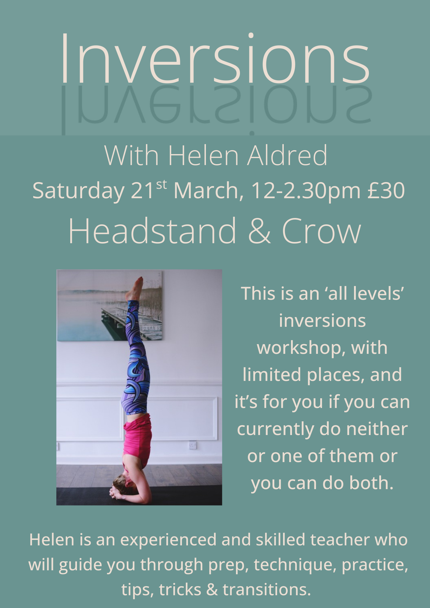 Join Helen for a Saturday afternoon exploring inversions. It doesn’t matter if you can or cannot do headstand and/or crow, this is an open level workshop with an experienced teacher. Limited places.